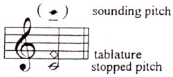 of the open or the stopped string. Second, he indicates in tablature the
